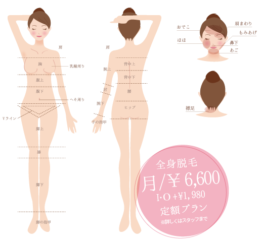 鼻下/ほほ あご/おでこ/ もみ上げ/ 眉まわり/ワキ 膝小僧 へそまわり 手の指/手の甲/ 足の指/デコルテ/ うなじ/肩/ Iライン/Oライン |